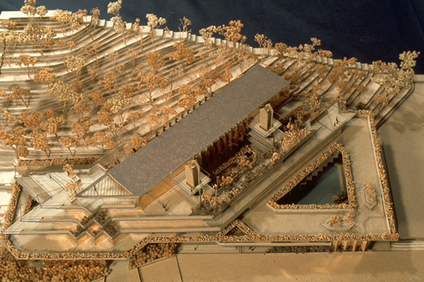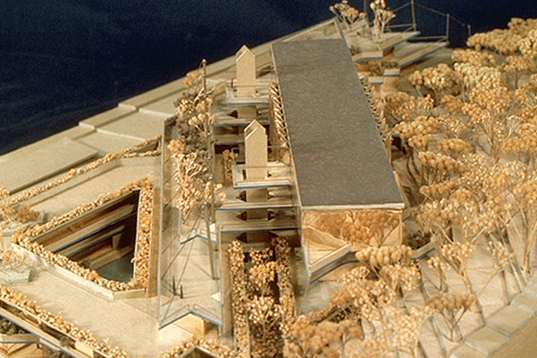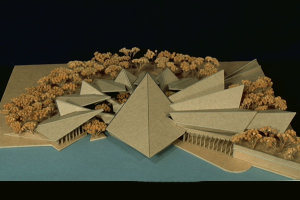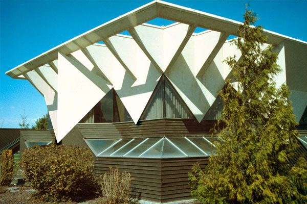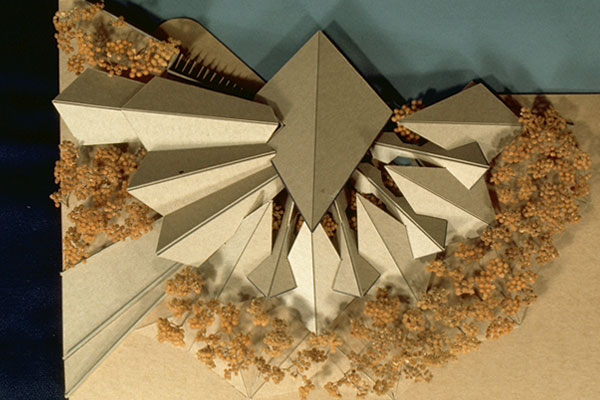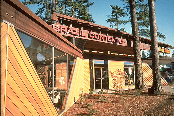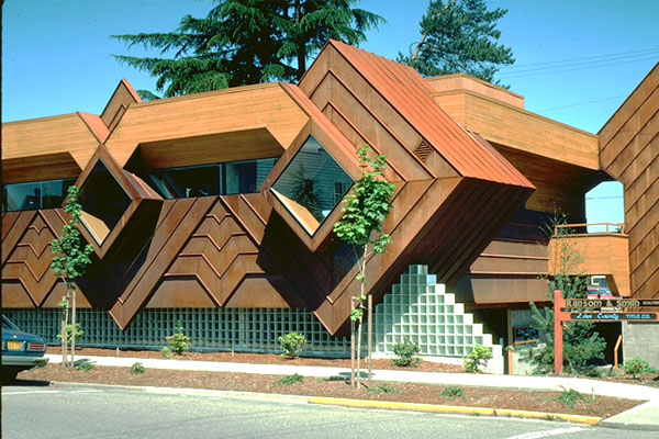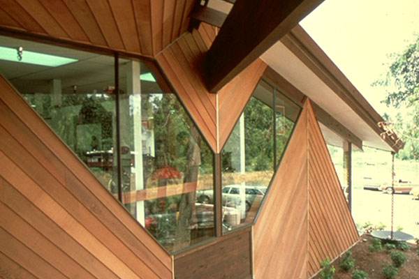 This building is a 22,000 square foot project located on a heavily traveled suburban commercial corridor. The building was designed with consideration given to the aesthetic distance and movement of the automobile oriented viewer. The floor plan is a series of diamond shapes. Angular windows, diagonal siding and metal ribbed roof echo and reinforce the plan's rhythm. Texture, light and shadow of the diagonal siding and pattern of the metal ribbed roof are constantly changing relative to the movement of the automobile viewer. However, the pedestrian finds a relaxing environment for shopping as the building is sited among thirty-six existing Douglas Fir trees and partially recessed below grade. Each shop entry is either a half flight of steps going down to a lower floor or a half flight going up to the upper floor or street level entry. The resulting design is one that relates to both the pedestrian and vehicular scale of the suburban strip. |