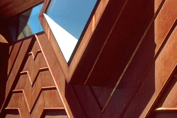 This office building is a 10,000 square foot project located in the center of a small Oregon town. It is a two-story building recessed five feet below grade. A half flight of steps extends from sidewalk level either down to the lower level or up to the top floor. Glass blocks were used on the lower level to let southern light into the interior while blurring the view of activities at sidewalk level. The dominating element of the building is its weathering steel, geometrically patterned, skin wall. This bas-relief wall gives the building a simple look; a low budget project that has a unique character, contrasting the mundane neighboring structures. |