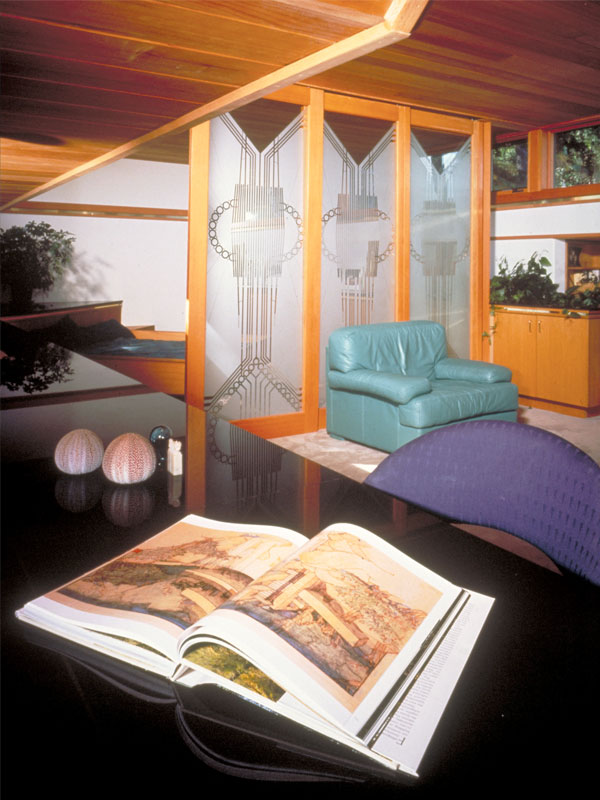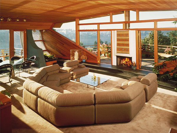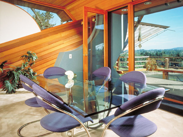 The site for this house is a 23,000-sq. ft. lot sloping up from the street. The 3,500-sq. ft. structure is funnel-like in shape: starting out with a small studio on the lowest level, moving to the children’s bedrooms on the middle level, and on the upper level where the view is the best, family community spaces and master bedroom suite. Sitting on two sono tubes that are 42 inches in diameter, 20 feet tall and 28 feet apart, the three-story structure (with each floor being split level creating six levels) cantilevers out of the hillside. The middle level of the house consists of a carport and entry. The children’s bedrooms are on the lower half of the split-level. The both bedrooms feature exterior walls sloping out at 30-degree angles. With these sloping walls it was possible to put built-in beds, sofa and work desk, yet still leave extra usable floor area which made these small rooms appear spacious. The upper level (a split and full level above the entry) is a large open community area consisting of kitchen, living and dining. The kitchen, semi-circular in plan and section, provides a panoramic view from its window seat outer wall. This space is a combination kitchen-family area featuring a built-in table and large granite counter areas. The living-dining area is a large open space with views of the river and Mt Hood. On the split-level up from the living area is an entertainment area with audio/video equipment, sofa/day bed and desk all built-into the space. Beyond are sliding sandblasted doors to a master bedroom suite. The lower level area has a teen room and the lowest level is devoted to a studio space with its own entrance. |