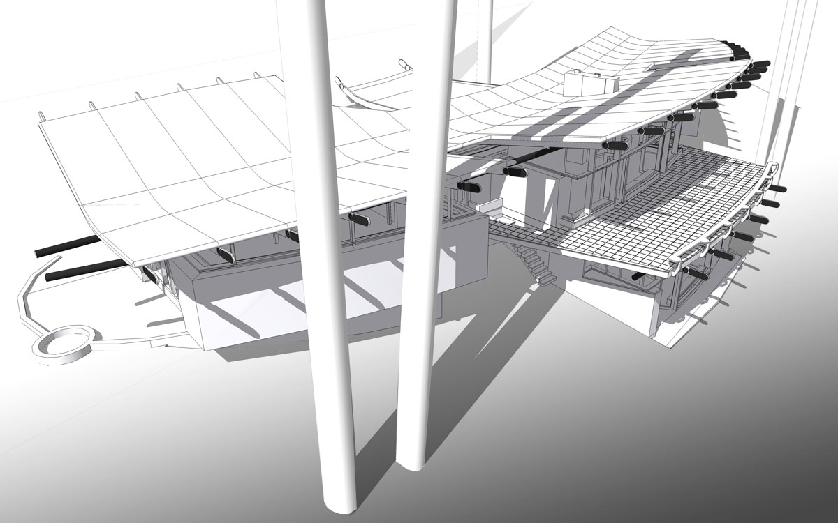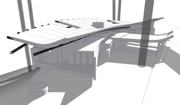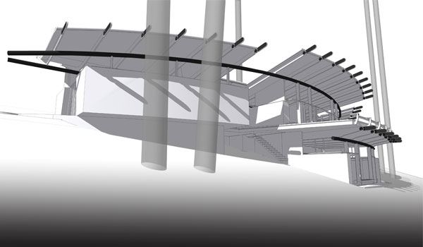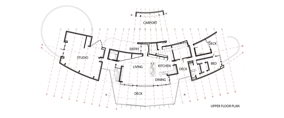 The Peterson home and artist studio shares a gentle sloping forested site. The form is governed by two sweeping steel pipe beams which run the length of the structure and support an array of radial glue-laminated beams that float above the structure. Laid out to take advantage of the southern exposure, the large cantilevered upsweeping roof allows plenty of sunlight to penetrate the living spaces during winter months when the sun angle is low, while blocking the sun in summer time. The material pallet of concrete, wood and steel flows in and out of the house creating a seamless sense of interior and exterior spaces. |