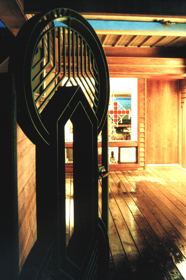 The interior spaces feature slate and carpet floors, white oak cabinets with granite counters, hemlock ceilings and custom beveled cedar walls. The exterior is woven together with custom beveled cedar siding, brown stone from central Oregon and teal colored stucco. The design achieved a modulation of components into ever-finer texture by the use of detailing of materials and the uses of elements such as the wrought iron screens at the windows and the entry gate. |