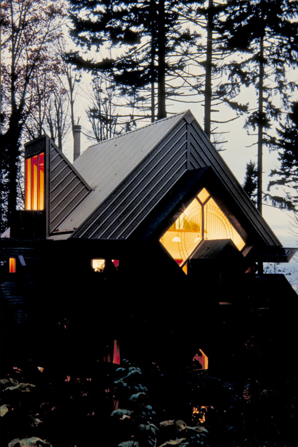 From the street, the house is entered via a bridge, which doubles as the carport access. The bridge springs from the hillside anchoring the house and giving reinforcement to the horizontal aspects of the design. Tall shafts of fir trees and the main massing of the house itself give the composition a strong interlocking counterpoint to the design and an overall feeling of anchoring the house to the steep site. |