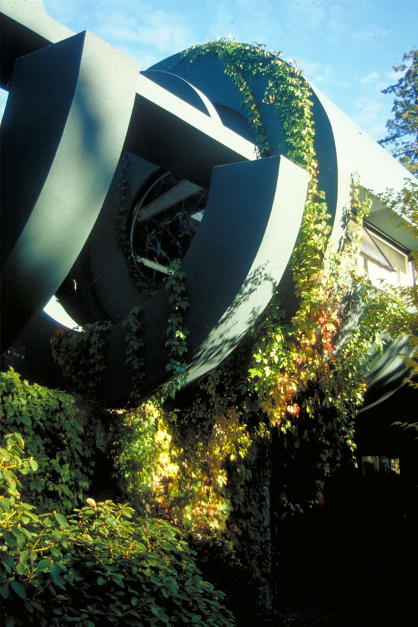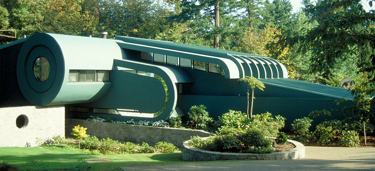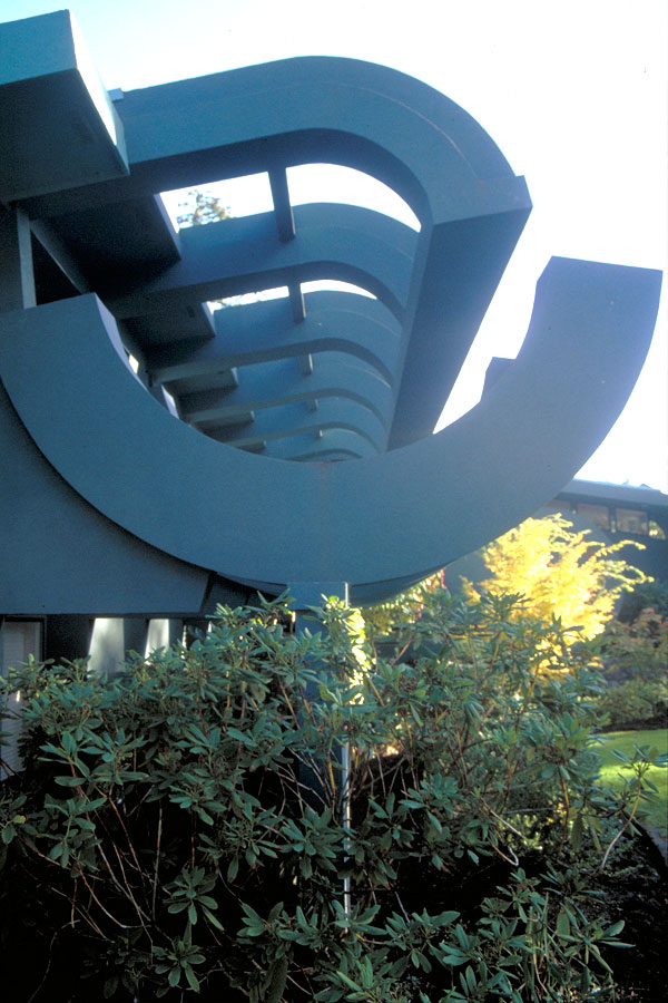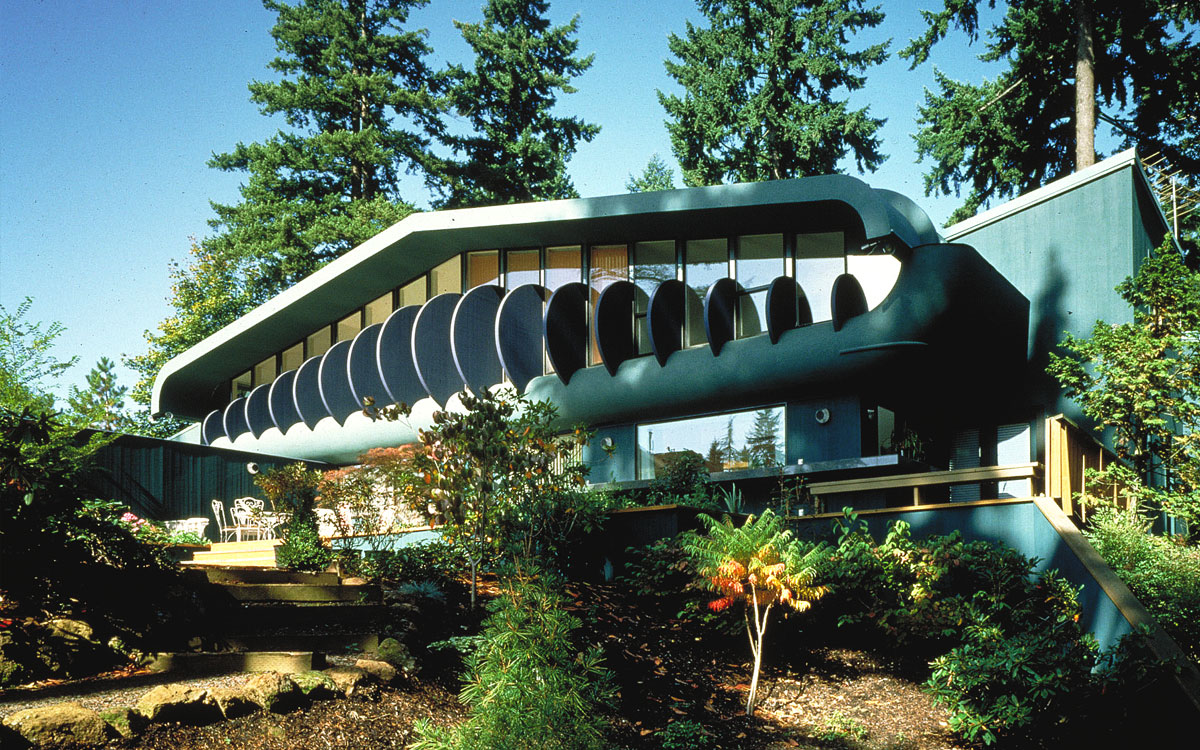 When the original house was built in 1972, it was isolated in the woods. The Williams bought the house in the 1980s. They fell in love with the property but were never able to feel the same way about the exterior of the house. Over the years the area developed into a neighborhood of traditional houses; a style they did not appreciate. n 1990 they hired Robert Oshatz to design an addition and completely new, non-traditional exterior appearance for their home. They wanted stucco to be the predominant material, for its durability and appearance. The roof slope of the addition matches the slope of the original house. The Williams’ were fond of circles and they became a theme of the design. The south side of the second-story is glazed with semi-circular disk-like fins at vertical mullions, providing privacy from the street. |