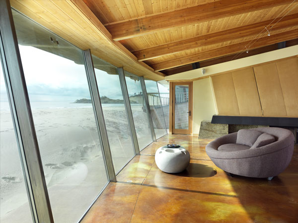 The house is on the central Oregon coast in Pacific City. The site is a tightly packed subdivision of homes sitting right on the sand. With homes 10 feet away on each side, seclusion and bringing sunlight into the structure were very important features of the design. This was mainly handled by omitting windows, except for high thin clerestory glazing, on the north and south sides of the house. Providing a large expanse of tall clerestory glazing across the front (eastside) of the house floods the interior with light yet maintains visual privacy from the street. The west side of the house is fully glazed, to take advantage of the stunning view of the ocean. In Oregon, even in summer, the western sunlight is a welcoming way to warm up the home. |